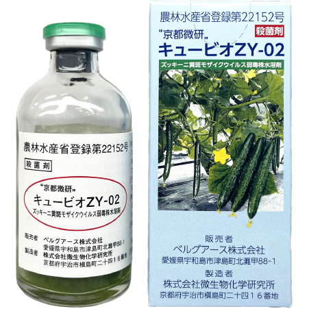2008年に凍結乾燥製剤として日本で初めて農薬登録されたズッキーニ黄斑モザイクウイルスの植物ワクチン「 “京都微研„ キュービオZY-02」。植物ワクチンの大量製造方法の確立に向け、㈱微生物化学研究所と共同で製造ラインを構築し大量製造・販売を行うとともに、3種類の植物ワクチンを混合接種したキュウリ苗の実証試験を実施。その成果を基に2023年から本格的に生産・販売を開始しました。