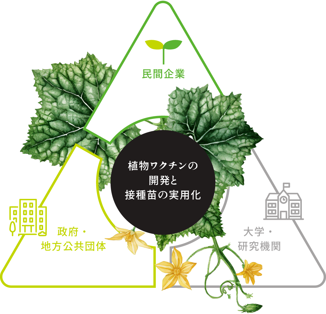 植物ワクチンの実用化実績のある(株)微生物化学研究所や野菜苗販売国内最大手のベルグアース(株)と連携し、目標を達成できる体制を整えています。そして、全国規模のネットワークを生かし、現在どの地域で、何のウイルスが流行っているのかを調査・分析することで、植物ワクチン接種苗需要の確認及び適切な普及拡大ができ、産地維持拡大及び生産者の収益増へ貢献できます。加えて、今後はどのようなワクチンが必要になるか、これからの研究に対して指針を立てることが可能になります。